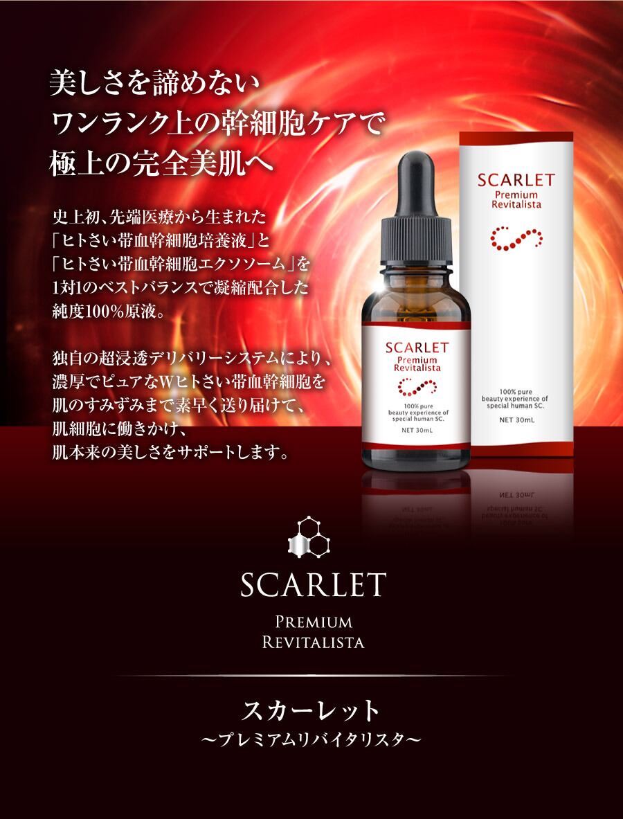 Wヒトさい帯処方「ヒトさい帯血幹細胞培養液」と「ヒトさい帯血幹細胞エクスソーム」を1対1で凝縮! スカーレットだけのベストバランス配合で100%原液です。