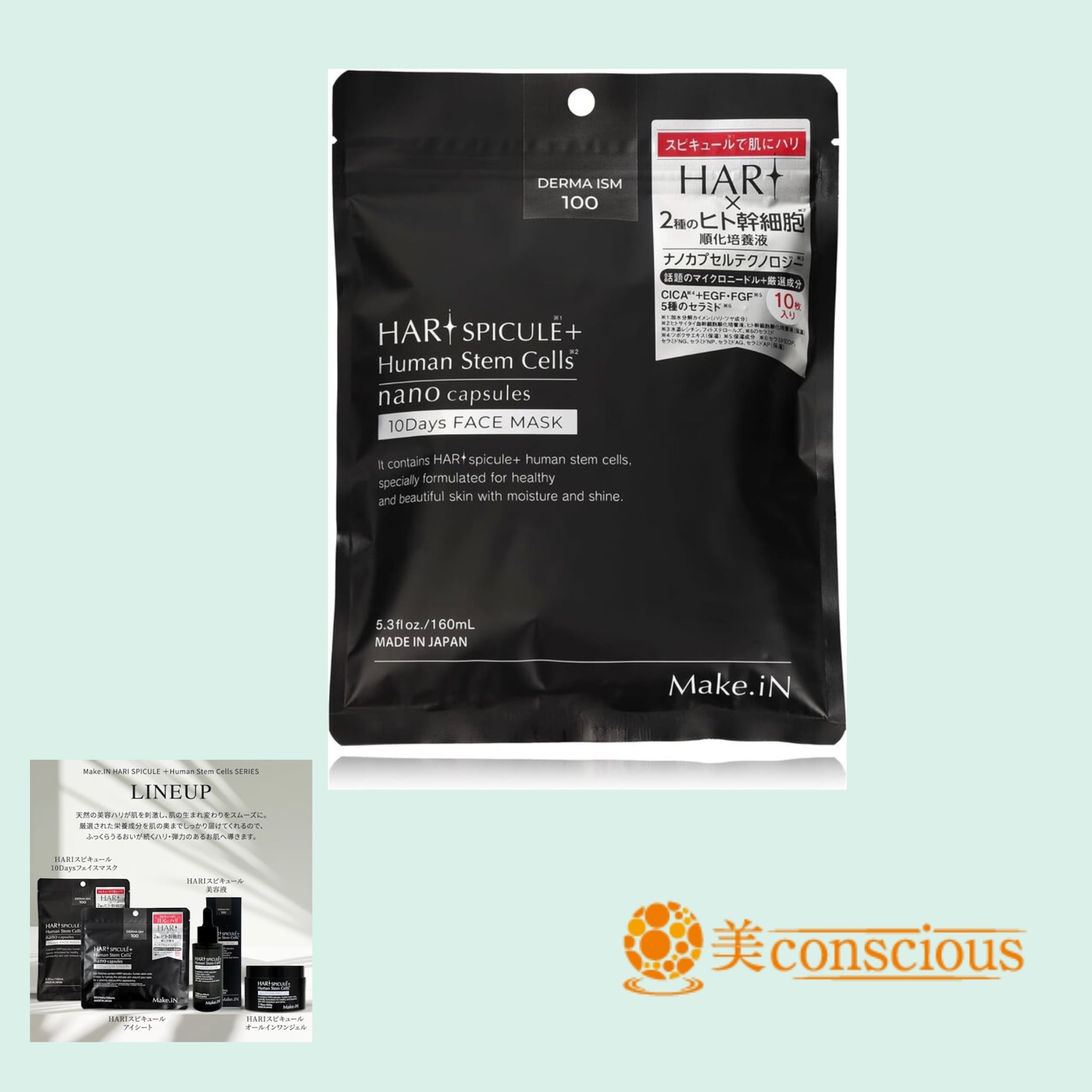 Make.iNの「HARI スピキュール+ヒト幹細胞 フェイスマスク」は、海由来のマイクロニードルと2種類のヒト幹細胞培養液、5種のセラミドを贅沢に配合。肌に豊富な美容成分をしっかり届け、みずみずしく弾むような肌へ導きます。